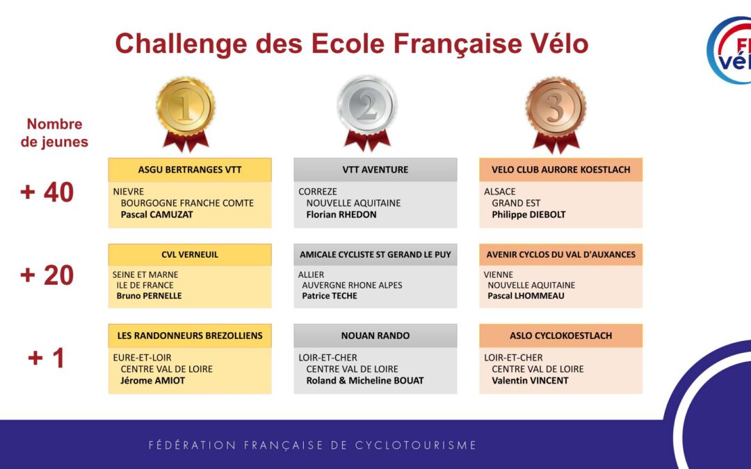 Les écoles de la région sont à nouveau très bien représentées dans le classement national du challenge des écoles françaises de vélo. Bravo au Vélo Club Aurore Koestalch qui termine sur le podium. Bravo à tous les éducateurs pour leur investissement et aux jeunes pour leurs participations aux évènements proposés par la FFCT.